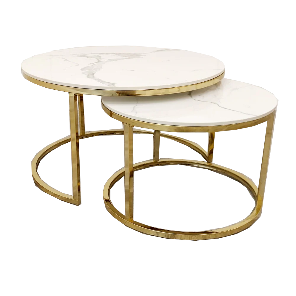 Cato Nest of 2 Short Round Coffee Tables – Gold Frame with Polar White Sintered Stone